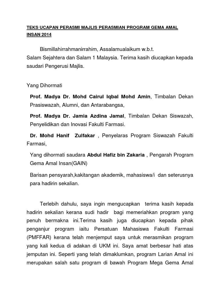Doc Contoh Teks Pengerusi Majlis Jamuan Akhir Sk Tunku Abdul Malik Academia Edu. Mohamed said bin mat lela naib canselor universiti malaysia pahang sempena majlis perasmian minggu induksi siswa universiti malaysia pahang 2007 di astaka universiti malaysia pahang pada hari ahad 1 julai 2007 pukul 1100 pagi salutasi yang berusaha saudara pengerusi majlis. 05062014 teks ucapan perasmidekan fst 1.